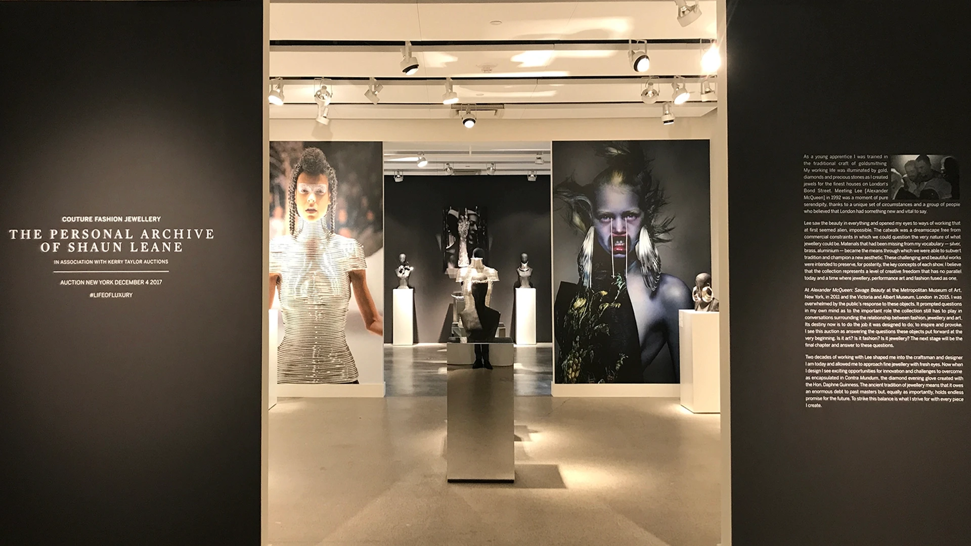 Leane’s cabochon crystal-bedecked Yashmak ‘2000 and other works from collaborations with McQueen are in permanent collections in London’s Victoria and Albert Museum (V&A) and he is the only jeweller to have works occupied, similarly, within three expressions in the museum: a Vine collection diamond engagement ring in Fine Jewellery, his Visionary cabochon crystal Yashmak in the High-Fashion department, and a cross-section of balcony from Leane’s architectural facade, Arbour, in Metal Work. Leane’s pieces are in permanent collections in New York’s Metropolitan Museum of Art and have featured in exhibitions at the Paris Galliera and Musée des Arts Décoratifs in Paris and ModeMuseum (MoMu) in Antwerp. The public sale of his sought-after personal historical archive broke sales records at Sotheby’s auction house in New York, with bespoke works sold at Christie’s Geneva, Phillips London, and at Sotheby’s London.